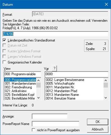 Mit dieser Option wird das Datum gemäß der Einstellung "Langes Datum" des Windows "Datums- und Uhrzeitenformats" angedruckt. Die Option kann nur dann aktiviert werden, wenn keine Formateingabe getätigt bzw. keine weitere Formatierungsfunktion aktiviert wurde.