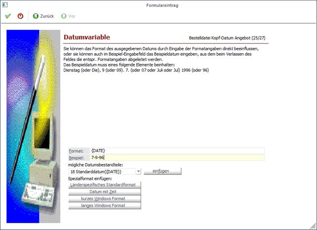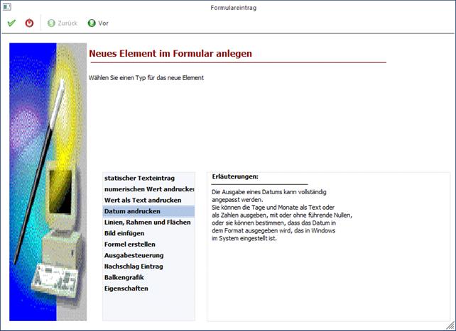 Durch Anklicken des VOR-Buttons können weitere Einstellungen zum Andruck der Variable eingegeben werden. Durch Anklicken des ZURÜCK-Buttons kann nochmals der Typ verändert werden. Durch Drücken der F5-Taste wird der Eintrag in das Formular übernommen. Durch Drücken der ESC-Taste wird das Fenster geschlossen.