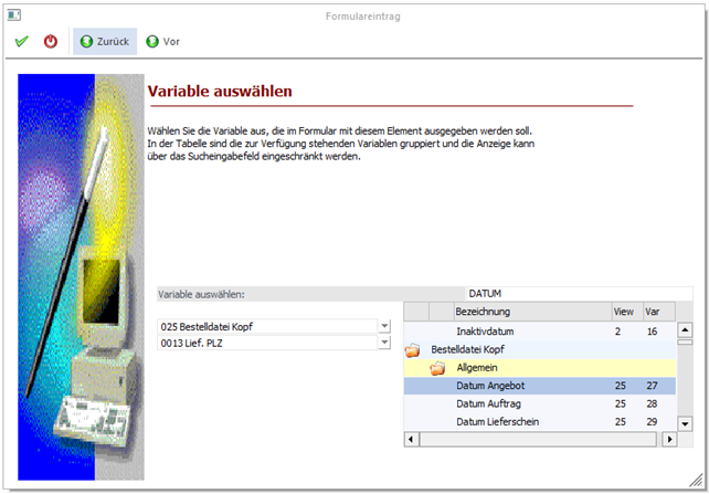 Durch Anklicken des ZURÜCK-Buttons kann die verwendete Variable verändert werden. Durch Drücken der F5-Taste wird der Eintrag in das Formular übernommen. Durch Drücken der ESC-Taste wird das Fenster geschlossen.