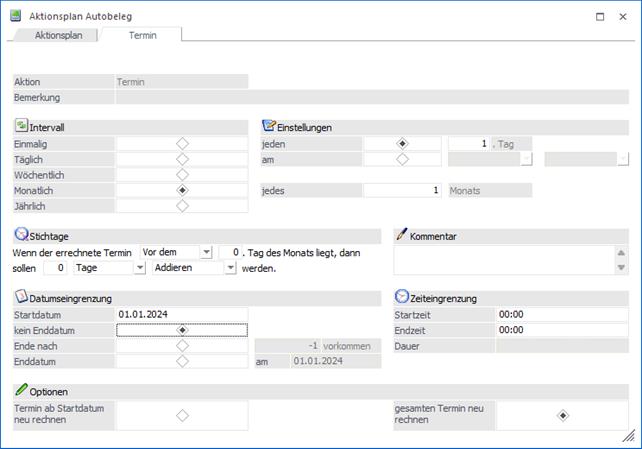 Mit der Option "Stichtage" kann das Datum der Kontaktaufnahme noch verschoben werden. Es kann definiert werden ob zu, nach oder vor einem bestimmten Tag des Monats ein definierter Zeitraum addiert oder subtrahiert werden soll.