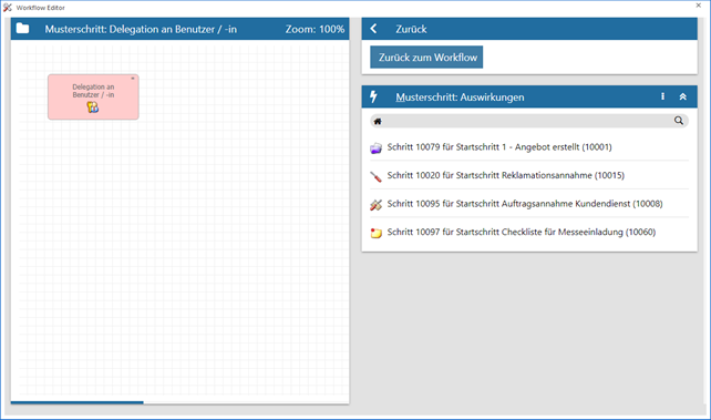 Als Musterschritt ist der Schritt "Delegation an Benutzer / -in" vorhanden. Wird dieser ausgewählt, so werden im Bereich "Musterschritt: Auswirkungen" jene Schritte angezeigt, die von diesem Musterschritt abgeleitet sind.