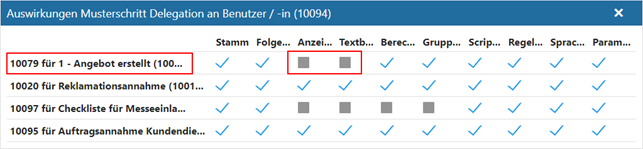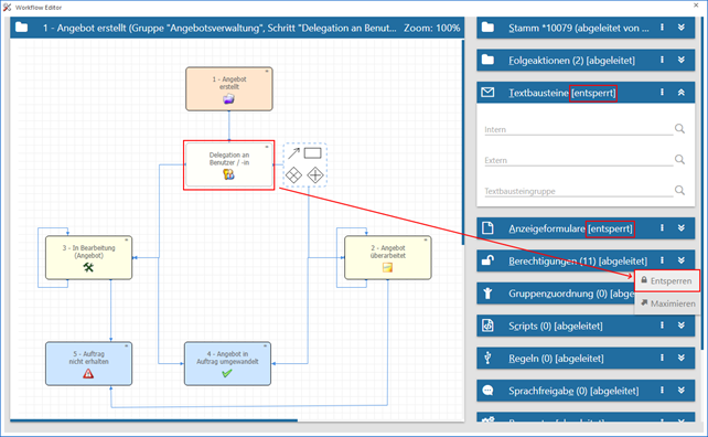 Der Schritt "10079" des Workflows "1 - Angebot erstellt" wurde vom Musterschritt "Delegation an Benutzer / -in" abgeleitet. Da die Textbausteine und die Anzeigeformulare in diesem Workflow individuell eingestellt werden sollen, wurde die Verknüpfung zum Musterschritt für diese Bereiche aufgehoben. Alle anderen Einstellungen stammen weiterhin vom Musterschritt.