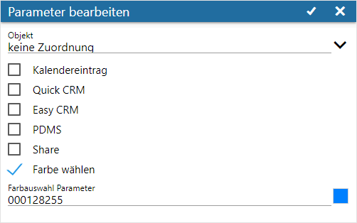 Die Auswahl der Farbe kann zum einen über eine vorgefertigte Farbpalette erfolgen, wobei auch die Anlage eigener Farben möglich ist. Zum anderen kann der Farbcode (RBG bzw. Hex) in dem Feld "Farbauswahl Parameter" direkt angegeben werden.