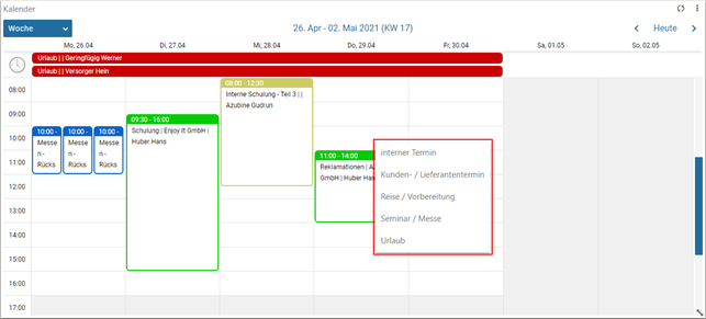Der Aufruf von möglichen CRM-Schritten erfolgt, indem mit der rechten Maustaste in die Kalenderansicht geklickt wird.