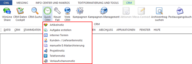 Durch Aktivieren dieser Option wird festgelegt, dass ein Aktionsschritt bzw. ein Startschritt als "Quick CRM-Schritt" ausgeführt werden kann. Solche Schritte können in verschiedenen Programmbereichen (Personenkontenstamm, Vertreterstamm, INFO-Module, Beleg CRM, etc.) direkt mittels Button "Quick CRM" ausgeführt werden kann. Die maximale Anzahl an Quick-CRM-Einträgen in den verschiedenen Menüpunkten ist mit 15 begrenzt. Die Anzeige erfolgt in alphabetischer Reihenfolge.