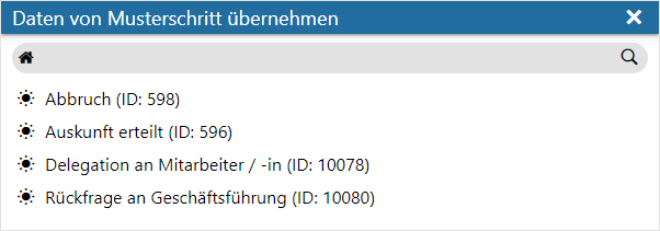 Bei Musterschritten handelt es sich um einen Schritt, welcher die (Ausgangs)-Basis für einen Workflow-, Neben- oder Endschritt bildet. Nähere Informationen entnehmen Sie bitte dem Kapitel Definitionsbereich - Musterschritt: Auswirkungen.