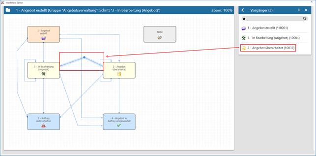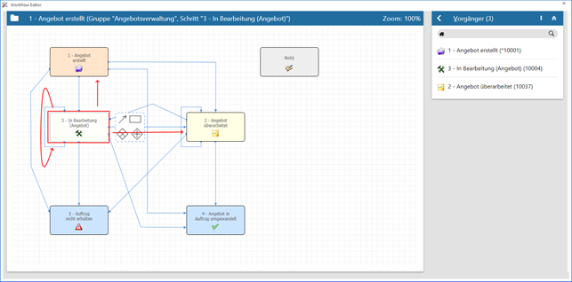 In diesem Beispiel ist der aktive Schritt "3 - In Bearbeitung (Angebot)". Dieser hat die Vorgänger "1 - Angebot erstellt", "2 - Angebot überarbeitet" und (per Schleife) "3 - In Bearbeitung (Angebot)".