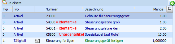 Das Steuergerät (Produktionsartikel mit Serien-/ Identnummer) wird mit folgender Stückliste hergestellt (innerhalb der Stückliste gibt es Ident- bzw. Chargennummernartikel):