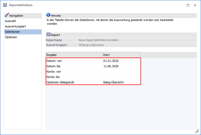 In dem Fenster "Reportdefinition" werden nach Anwahl des Buttons "ActionServer Report" alle in der Auswertung genutzten Selektionsmöglichkeiten dargestellt und können editiert werden.