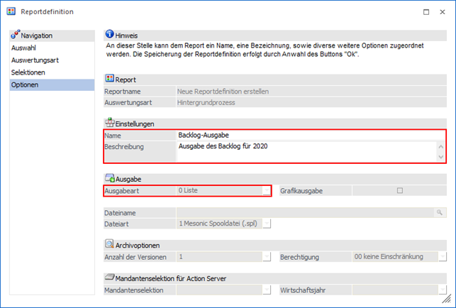 Mit dem Ribbon-Button "Vor" gelangt man in den nächsten Schritt "Optionen". Hier muss ein Name für die Reportdefiniton vergeben werden.