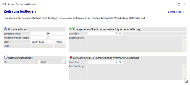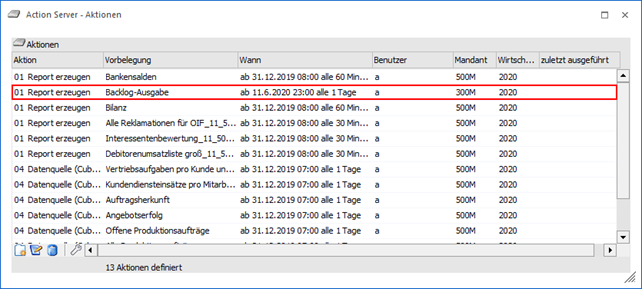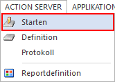 Durch Anwahl des Buttons "Ok" wird die Definition gespeichert, geschlossen und das Fenster "Action Server - Aktionen" geöffnet. Die Aktion ist automatisch mit der gerade angelegten Reportdefinition verknüpft. Im letzten Schritt kann ein Zeitraum festgelegt werden.