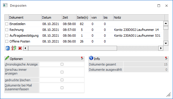 Die Ausdrucke, die sich im Spooler befinden, können zwar nicht mehr verändert, jedoch betrachtet, gedruckt und gemailt werden. Der Spooler an sich ist in jeder Applikation über den Menüpunkt