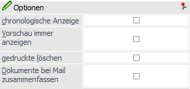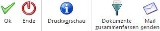 Mit Hilfe dieses Buttons können die ausgewählten Dokumente per E-Mail gesendet werden. Ob die Dokumente hierbei zusammengefasst werden sollen, wird über die Option "Dokumente bei Mail zusammenfassen" definiert.