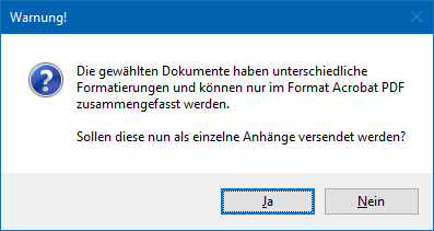Bei Anwahl des Buttons "Mail senden" werden die ausgewählten Dokumente per E-Mail versendet, wobei hier definiert werden kann, ob eine Zusammenfassung erfolgen soll.