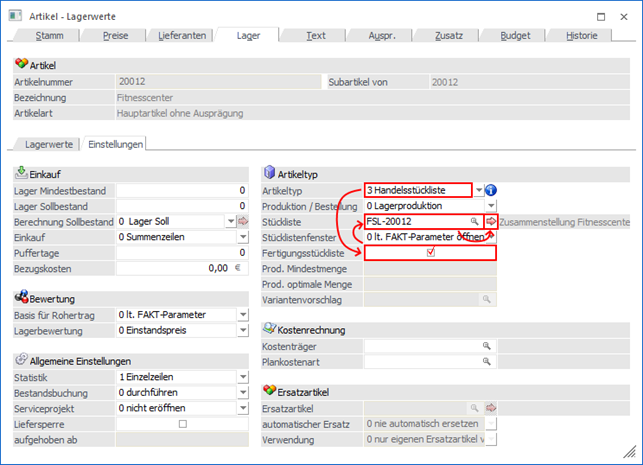 Zunächst wird der Artikel definiert, der eine Fertigungsstückliste werden soll. Die Anlage unterscheidet sich dabei zunächst nicht von der eines Standard-Artikels. Im Register "Lager" (Unterregister "Einstellungen") werden dann folgende Einstellungen getroffen: