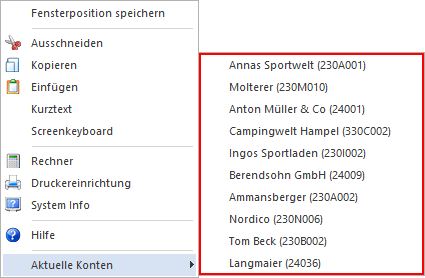 Abhängig vom aktuellen Eingabefeld werden die letzten 11 WinLine-Objekt vorgeschlagen, mit welchen agiert wurde. Bei Auswahl eines der Objekte, wird jenes in das Ausgangsfeld übertragen. Bei den folgenden Feldern steht die Funktion zur Verfügung: