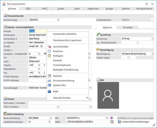 Wenn ein Fenster geöffnet ist (z.B. eine Eingabemaske) gibt es - abhängig vom aktiven Eingabefeld - weitere Möglichkeiten: