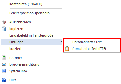 Damit wird der Inhalt der Zwischenablage in das aktuelle Eingabefeld kopiert. Wird der Einfügen-Befehl in einem RTF-Feld ausgeführt und befindet sich in der Zwischenablage ein RTF-Text, so kann mittels den Untermenüpunkten entweder der Text unformatiert oder als formatierter Text (RTF) eingefügt werden.