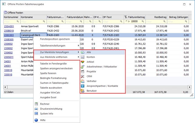 Mit Hilfe dieser Funktionen können die Daten der Tabelle, gemäß der definierten Objektauswahl des Untermenüs, in eine Merkliste / Kampagne übergeben oder entfernt werden.