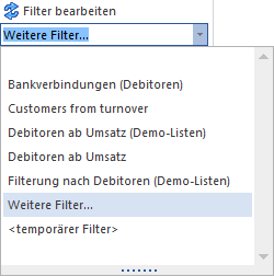 Aus der Auswahlliste kann ein bereits angelegter Filter für die Selektion und / oder Sortierung der Auswertung gewählt werden. Durch Anwahl des Buttons Filter bearbeiten kann ein Filter angelegt oder editiert werden. Sollten mehr als 5 Filter angelegt worden sein, so steht der Eintrag "Weitere Filter…" zur Verfügung, worüber sich der Filter Matchcode öffnet.