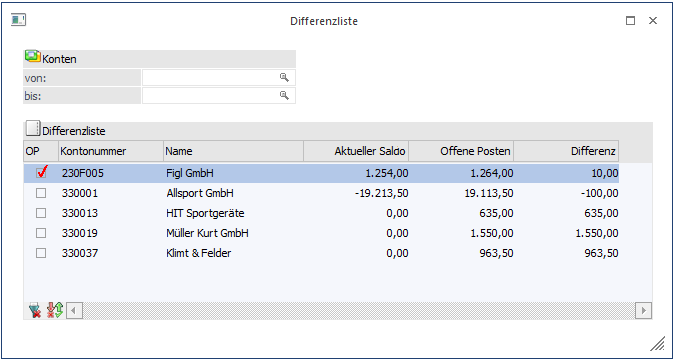 Die Differenzliste weist sämtliche Personenkonten aus, bei denen ein Unterschied zwischen dem FIBU-Saldo und dem OP-Saldo besteht.