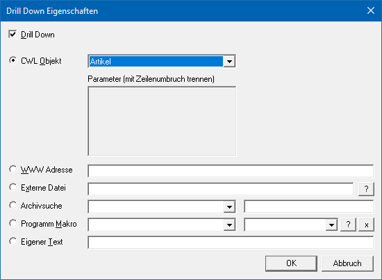 Eigenschaftsfenster "Drill Down Eigenschaften"