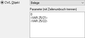 Im Standard werden aus der aktuellen Datensatzzeile die Informationen T025.C021 (Kontonummer) und T025.C022 (Laufnummer) benötigt. Sollten diese Daten aus anderen Variablen stammen, dann kann dieses im Bereich "Parameter" angepasst werden. Der Parametereintrag "0" darf hierbei nicht geändert werden.