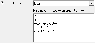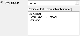 Wenn das Objekt "Listen" hinterlegt wird, dann kann per Anwahl der Variable eine fest definierte WinLine LIST-Liste aufgerufen werden. Alle Einstellungen hierfür werden im Bereich "Parameter" vorgenommen.