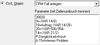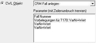Mit Hilfe des Objekts "CRM Fall anlegen" kann eine fest definierte CRM Aktion oder ein fest definierter CRM Workflow gestartet werden. Alle Einstellungen hierfür werden im Bereich "Parameter" vorgenommen.