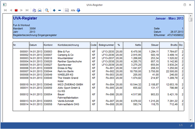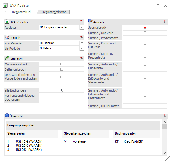 Der Ausdruck des UVA-Registers erfolgt im Menüpunkt