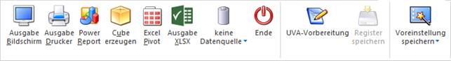 Das gewählte Register kann entweder am Bildschirm oder Drucker ausgegeben werden. Weiters kann ein Cube erzeugt oder eine BI-Ausgabe erstellt werden. Mit Drücken der F5-Taste wird die standardmäßige Bildschirmansicht ausgegeben.