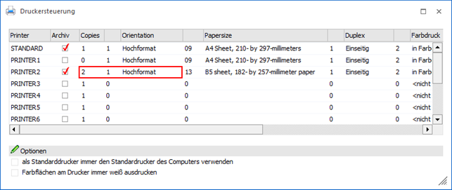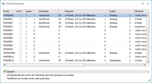 Durch diese Einstellung wird der eingetragene Standarddrucker ignoriert und stattdessen immer der Standarddrucker des Systems verwendet. Zusätzliche Einstellungen die in der Tabelle gewählt werden können (wie z.B. Hoch- oder Querformat) werden trotzdem auf den Drucker angewendet. Die anderen Drucker beeinflusst diese Einstellung nicht.