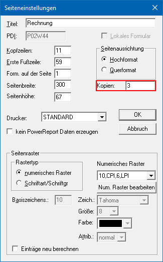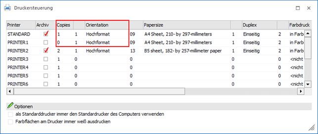 Beträgt die Anzahl der Kopien 0 oder 1 (und ist als Orientation Hochformat eingestellt) wird die Anzahl der Kopien lt. Einstellungen im Formular verwendet. Ist die Angabe >1 wird die Einstellung lt. Druckersteuerung verwendet.