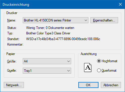 bei jedem Druckbefehl in der MWL der Druckerdialog. Im Druckerdialogfenster kann