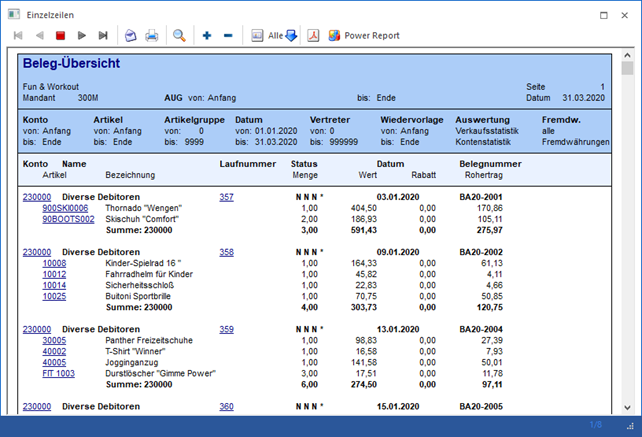 Weitere Informationen und Besonderheiten der Ausgabe können dem Kapitel "Druckvorschau als Power Report" entnommen werden.