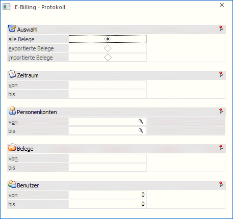 Im Menüpunkt "E-Billing - Protokoll" können alle erfolgreichen Ex- bzw. Importe von Belegen, die im Menüpunkt "E-Billing" durchgeführt wurden, ausgewertet werden.