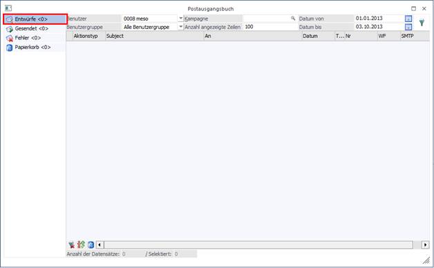 ü 2 Mail im Postausgangsbuch speichern: XML-Dateien und/oder PDF-Dateien werden im Postausgangsbuch im Ordner "Entwürfe" abgelegt und können von dort versandt werden.
