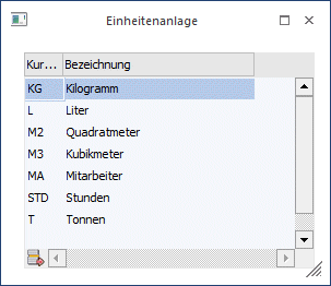 Um eine Einheit neu anzulegen, muss nur der Cursor in die nächste freie Zeile gestellt werden. Hier kann ein Kurzcode und eine Bezeichnung eingegeben werden. Mit dem OK-Button wird die Eingabe gespeichert.