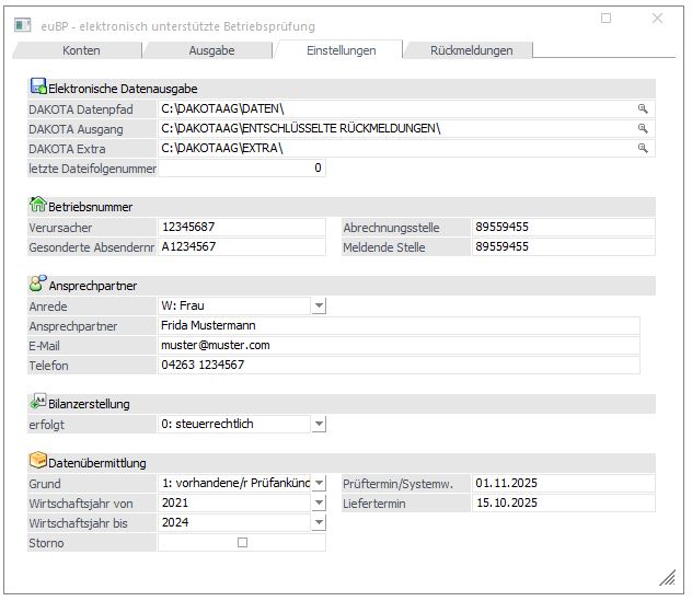 Erfolgt die Buchhaltung in einem abweichenden Wirtschaftsjahr, muss der Prüfungstermin im zu hinterlegenden auszugebenden Zeitraum im Register "Einstellungen" der Auswertung "euBP" an die "Grundsätze für die Übermittlung der Daten für die euBP" angepasst werden.