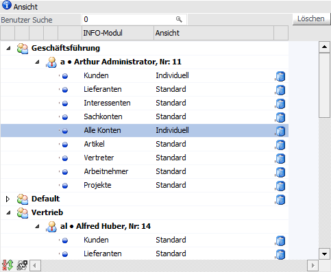 In dieser Spalte werden alle INFO-Module pro Benutzer aufgelistet. Durch Anwahl eines Moduls wird die rechte Tabelle (Darstellung) aktualisiert.