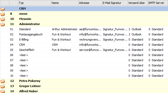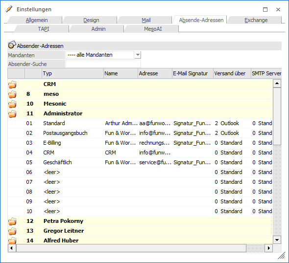 Innerhalb eines Benutzers ist zwischen vier fixen und sechs frei zu definierenden Adressen zu unterscheiden. Bei fixen Einträgen ist die Spalte "Absender-Adressen-Typ" nicht editierbar.
