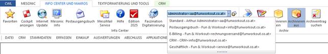 Die manuelle Auswahl einer alternativen Absender-Adresse erfolgt im Ribbon "INFO CENTER UND MAKROS". In diesem gibt es die Auswahlbox "Absende-Adresse" über welche die Adresse definiert werden kann.
