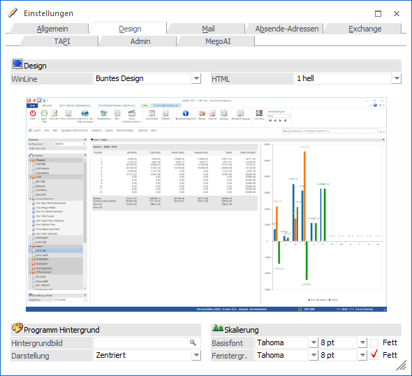 In diesem Bereich kann eingestellt werden, wie groß die Fenster und die Fensterinhalte in der WinLine dargestellt werden sollen. Standardmäßig sind der Basisfont und die Fenstergröße auf 8 pt Tahoma eingestellt. Dies bedeutet, dass die Fenster bei einer hohen Auflösung relativ klein dargestellt werden. Damit die Fenster und deren Inhalt "größer" bzw. die Schriftart angepasst werden können diese Einstellungen bearbeitet werden.