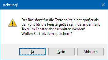 Beim Speichern des Fensters wird geprüft, ob die Fontgrößen "zusammenpassen". Wenn z.B. der Basisfont mit einer größeren Schriftart definiert wurde, als die Schriftart für die Fenstergröße, dann wird eine entsprechende Meldung ausgegeben: