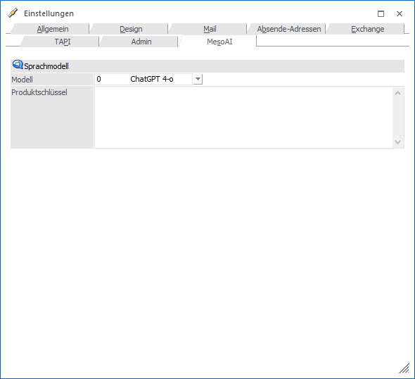 Im Register "MesoAI" kann der Produktschlüssel für die Verwendung der Funktion MesoAI hinterlegt werden. Dieser Produktschlüssel ist notwendig, um die entsprechenden Funktionen in folgenden Bereichen durchführen zu können: