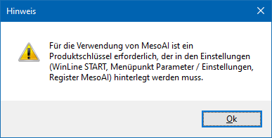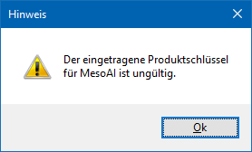 Wurde hier kein Produktschlüssel oder ein falscher Produktschlüssel hinterlegt, und wird trotzdem eine der angeführten MesoAI-Funktionen angewählt, wo wird in weiterer Folge eine entsprechende Meldung ausgegeben: