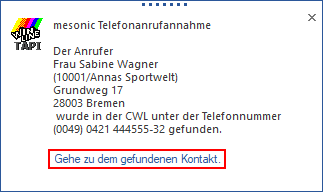 Wurde diese Option aktiviert, so wird bei einem Anruf, dessen Telefonnummer nicht im aktuellen Mandanten, sondern in einem anderen gespeichert ist, nicht automatisch eine neue Instanz mit jenem Mandanten gestartet. Stattdessen wird im Popup angezeigt, dass die Nummer aus einem anderen Mandanten stammt und man kann mit dem Link im Popup zu diesem Mandanten wechseln, wo dann der zur Nummer gehörende Datensatz angezeigt wird.