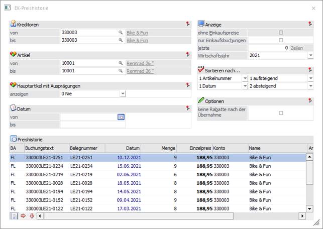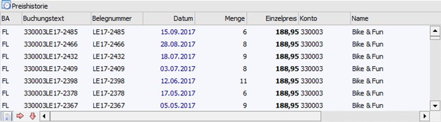 In der Preishistorie erhält man eine Aufstellung über die verschiedenen Preise, mit denen ein Artikel fakturiert wurde (einkaufsseitig). Diese Preise können in weiterer Folge auch in die Belegerfassung übernommen werden können.