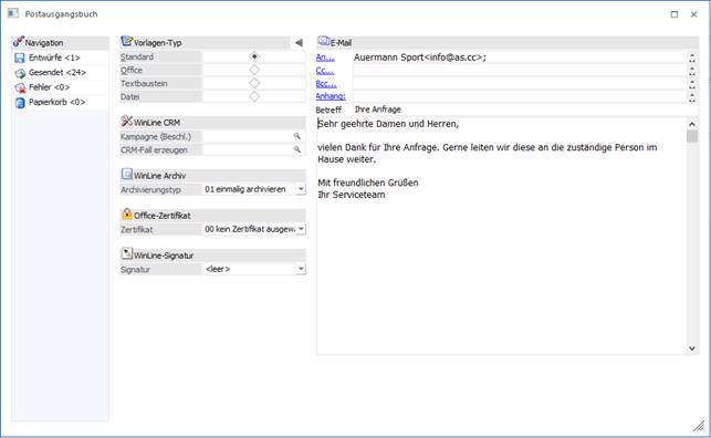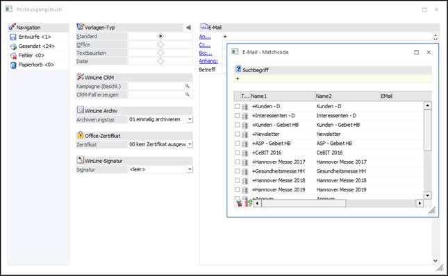 Wenn das Postausgangsbuch aus der Merkliste, der Kampagne o. ä. geöffnet wird, verwendet das Programm automatisch "Serien-E-Mail". Hierbei können alle Optionen zum detaillierten Schreiben verwendet werden.