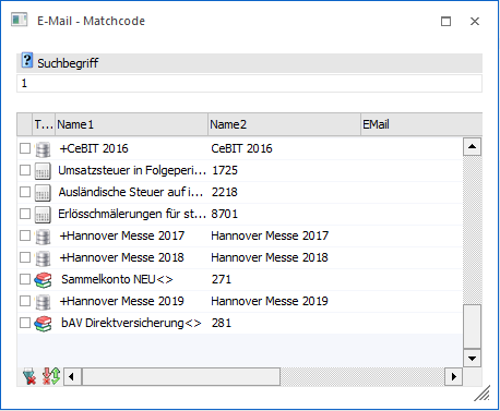 Im sich öffnenden Fenster "E-Mail-Matchcode" kann nach allen E-Mail-Empfängern gesucht werden. Der (oder die) im Matchcode ausgewählte(n) Datensatz (Datensätze) werden in den entsprechenden Feldern angezeigt.